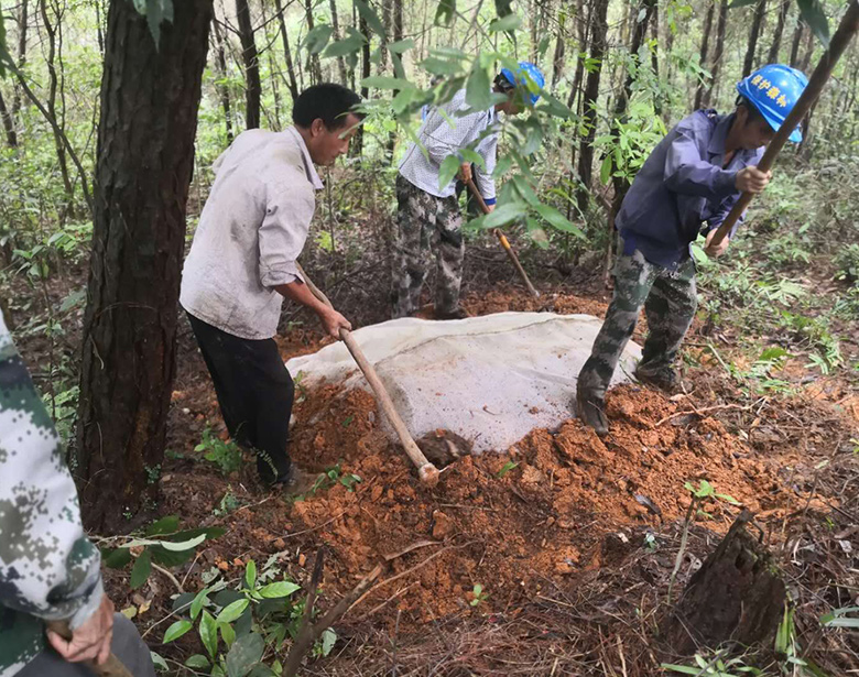五埋:即在包好塑料的伐桩上埋土并压紧压实望料薄膜。