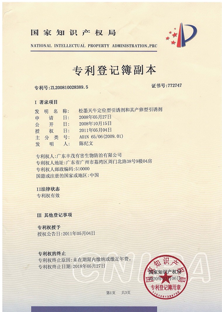 发明专利:松墨天牛定位型引诱剂和其产卵型引诱剂